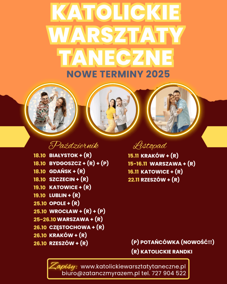 ❣️ Terminy PAŹDZIERNIK 2025 ❣️Warsztaty Taneczne dla Katolickich Singli i Par 💃🕺 💒 Wartości. 💞 Relacje. 🎶 Integracja 💫 Co Cię czeka? 📍 Gdzie i kiedy? Wybierz miasto, termin i styl, który Ci pasuje — a potem… po prostu zatańcz! 📍Miasto 📅 Termin 💃 Wydarzenie 🔗 Link 📍Białystok 18.10.2025 Warsztaty Taneczne👉 https://forms.gle/sbekuVL9B9j52BJe7 📍Białystok 18.10.2025 Katolickie…