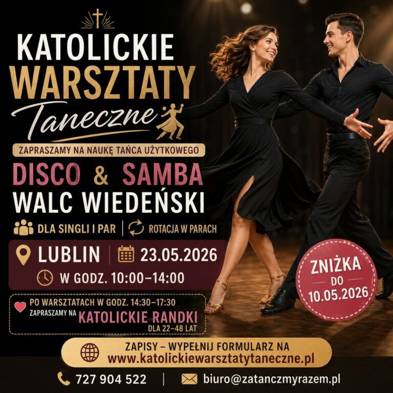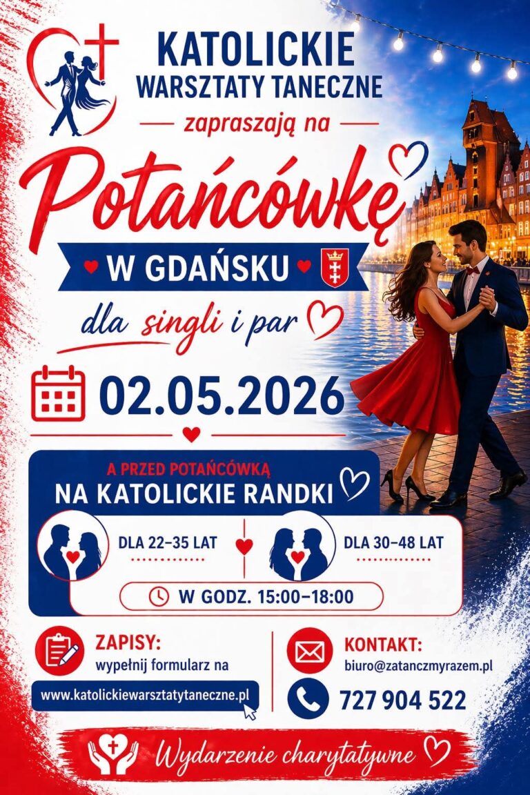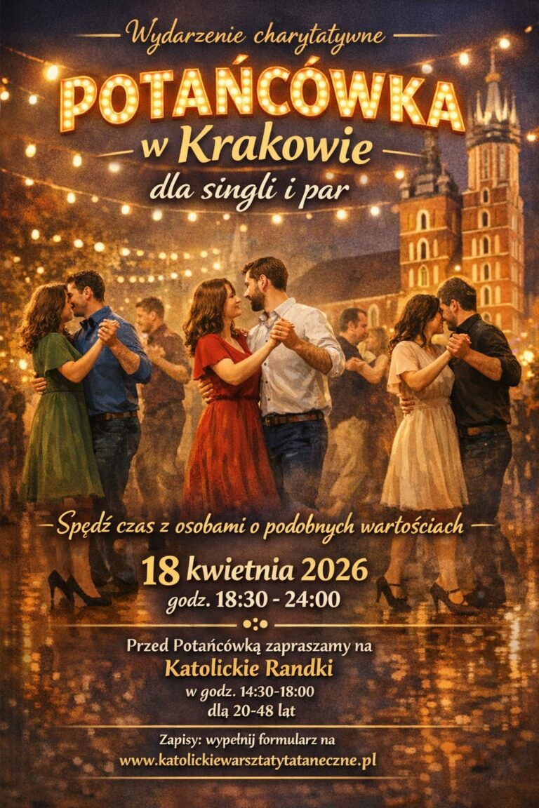 🎉 Potańcówka w Krakowie! 💃🕺dla singli 🙋 i par 👩❤️👨 📅 18.04.2026 | ⏰ 18:30–24:00📍 Aula św. Kingi, Parafia Matki Boskiej Fatimskiejul. Komandosów 18, Kraków Zapraszamy na wyjątkową zabawę taneczną w gronie osób o podobnych wartościach 💒 Sala pomieści do 130 osób 🔥 ❤️ Wydarzenie charytatywne💰 Cena udziału: 85 zł Impreza otwarta dla wszystkich dorosłych…