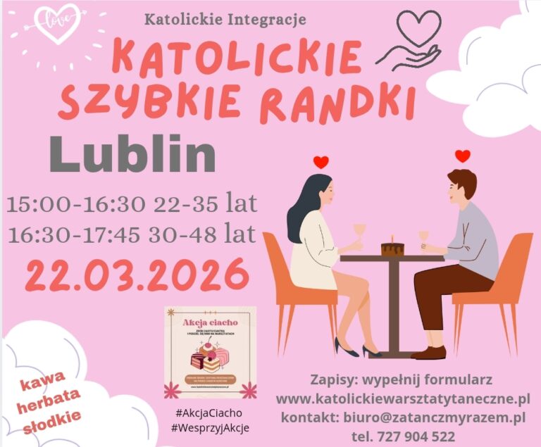❣️Lublin 🌟 Zapraszamy na Katolickie Szybkie Randki! 🌟 Szukasz miłości swojego życia? Chcesz poznać wartościowe osoby, które podzielają Twoje przekonania? Dołącz do naszych katolickich szybkich randek i daj sobie szansę na znalezienie przyszłej żony lub męża! 💒 Dlaczego warto? Spotkasz osoby, które podzielają Twoje wartości i wiarę.Przeżyjesz kilkanaście 5-minutowych randek, które mogą odmienić Twoje życie.Spędzisz…